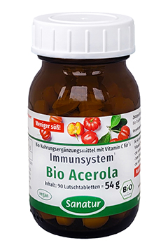 Da der menschliche Körper Vitamin C nicht selbst herstellen kann, müssen wir das Vitamin regelmäßig mit der Nahrung aufnehmen. Es gehört zu den wasserlöslichen Vitaminen und kann bereits beim Lutschen oder Kauen aus den Speisen gelöst werden. Verbleibt es lange genug im Mund, wird es über die Mundschleimhaut aufgenommen. Diese Eigenschaft macht Lutschtabletten für Vitamin C interessant und zu einer genialen Versorgung für die ganze Familie. Sanatur BioAcerola Tabletten kombinieren Acerola mit Traubenzucker für ein mild süßes Geschmackserlebnis.